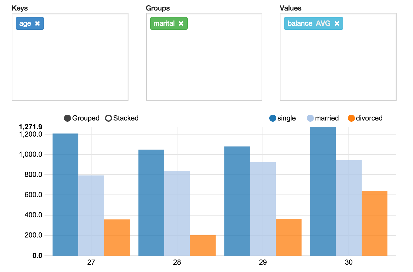 Apache Zeppelin aggregates values and displays them in pivot chart with simple drag and drop. You can easily create chart with multiple aggregated values including sum, count, average, min, max.