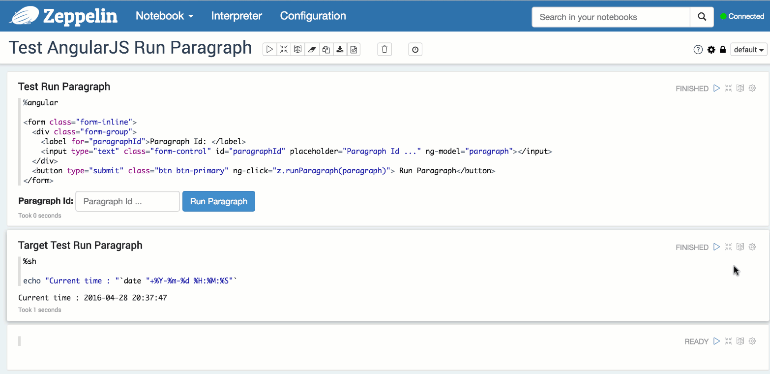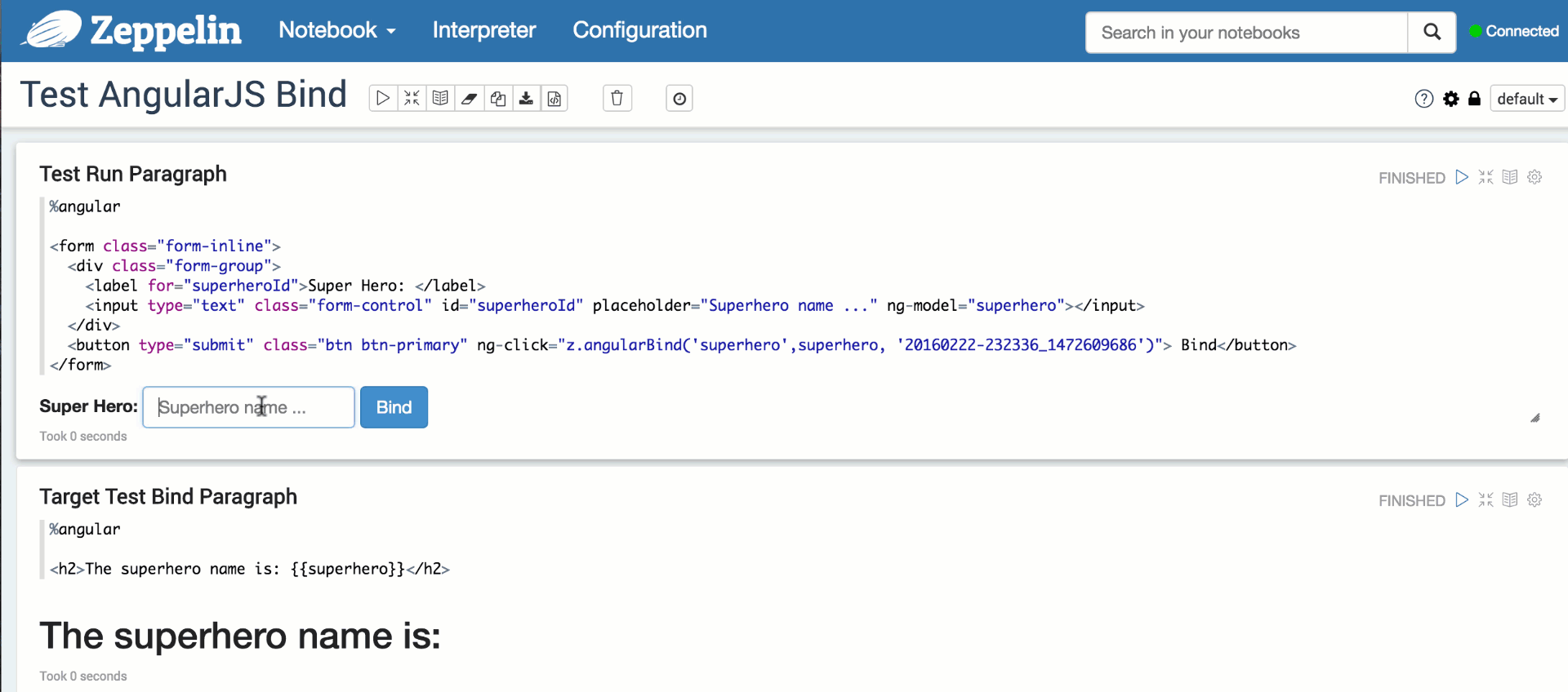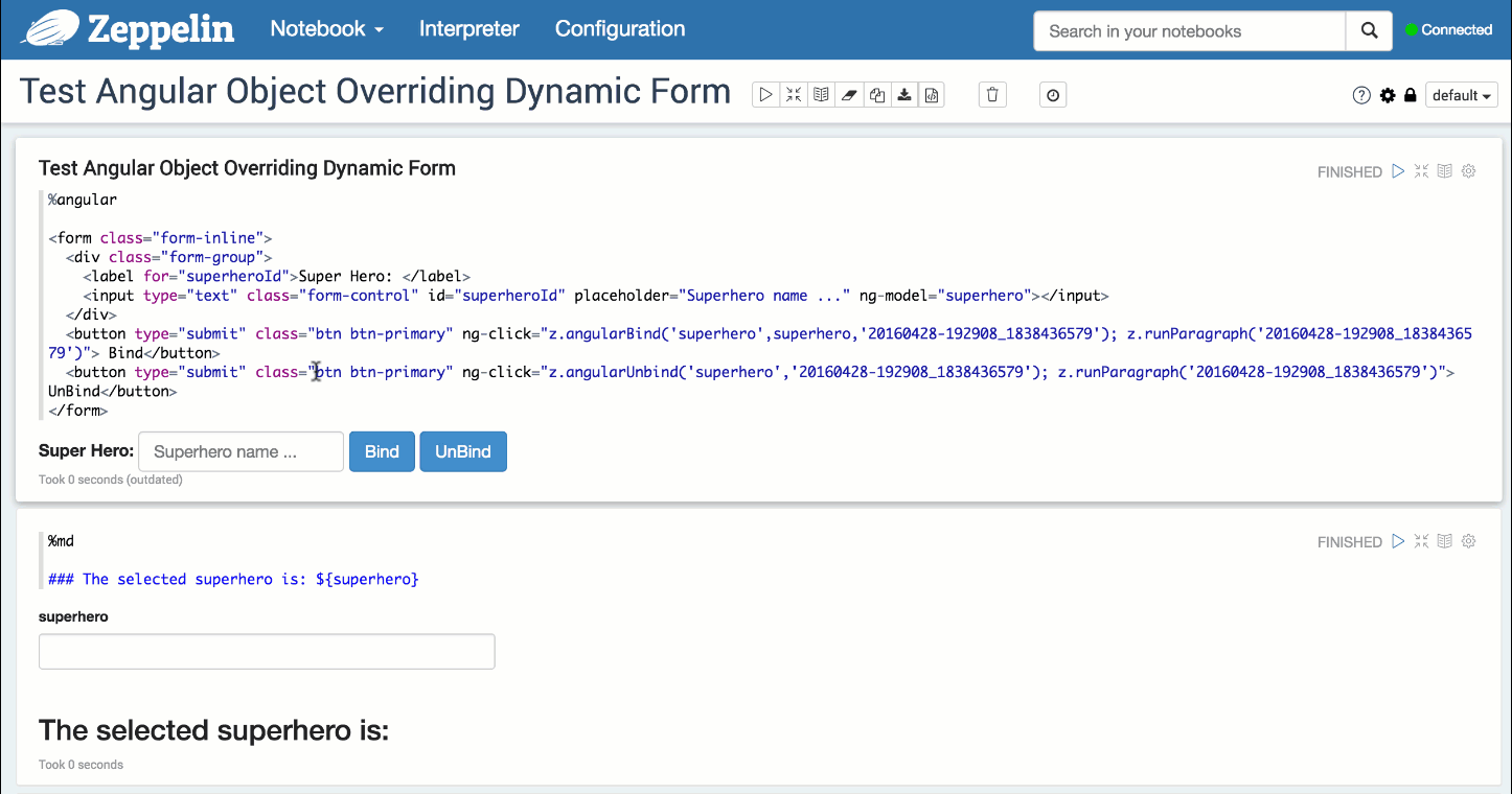 In addition to the back-end API to handle Angular objects binding, Apache Zeppelin also exposes a simple AngularJS z object on the front-end side to expose the same capabilities.