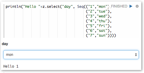 println("Hello "+z.select("day", Seq(("1","mon"),