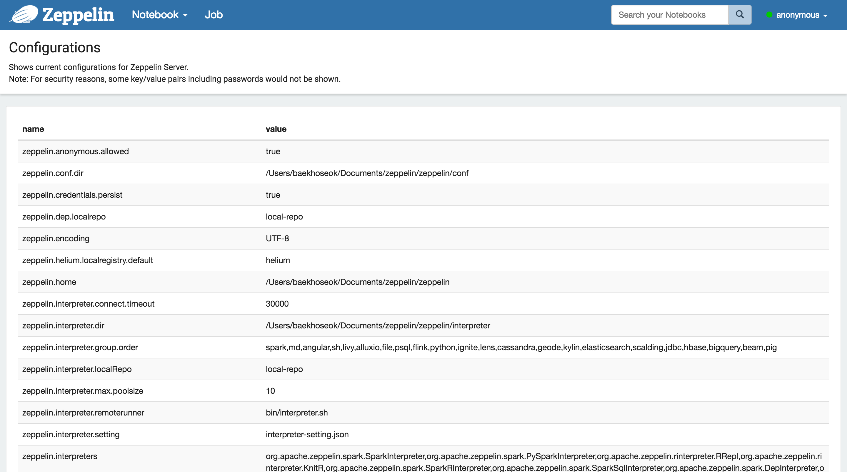 This menu displays all the Zeppelin configuration that are set in the config file $ZEPPELIN_HOME/conf/zeppelin-site.xml