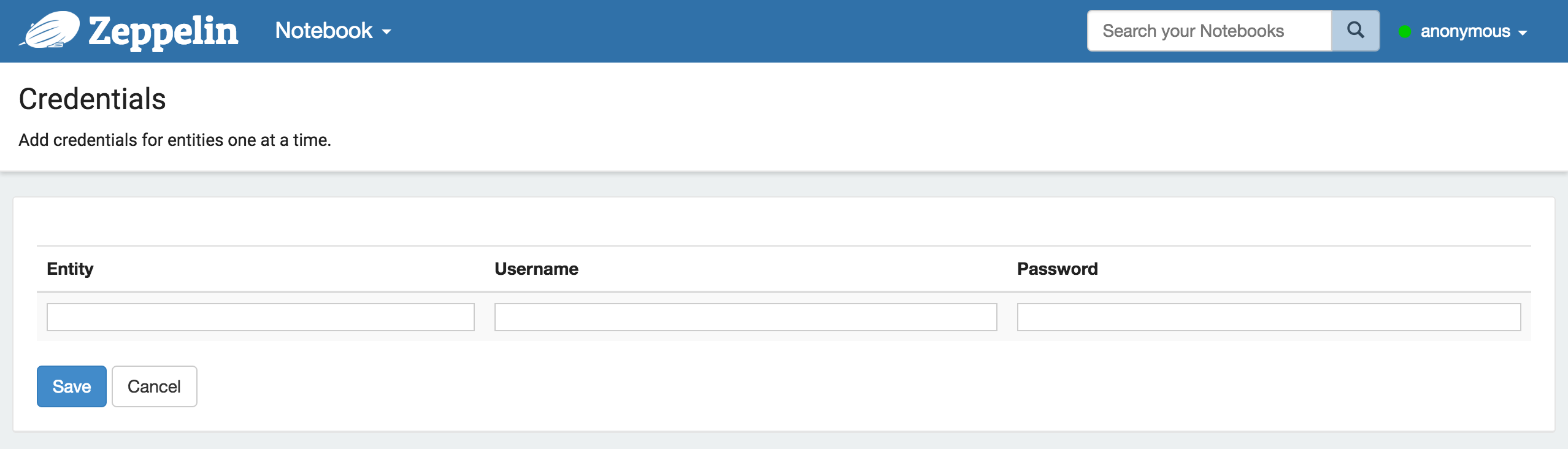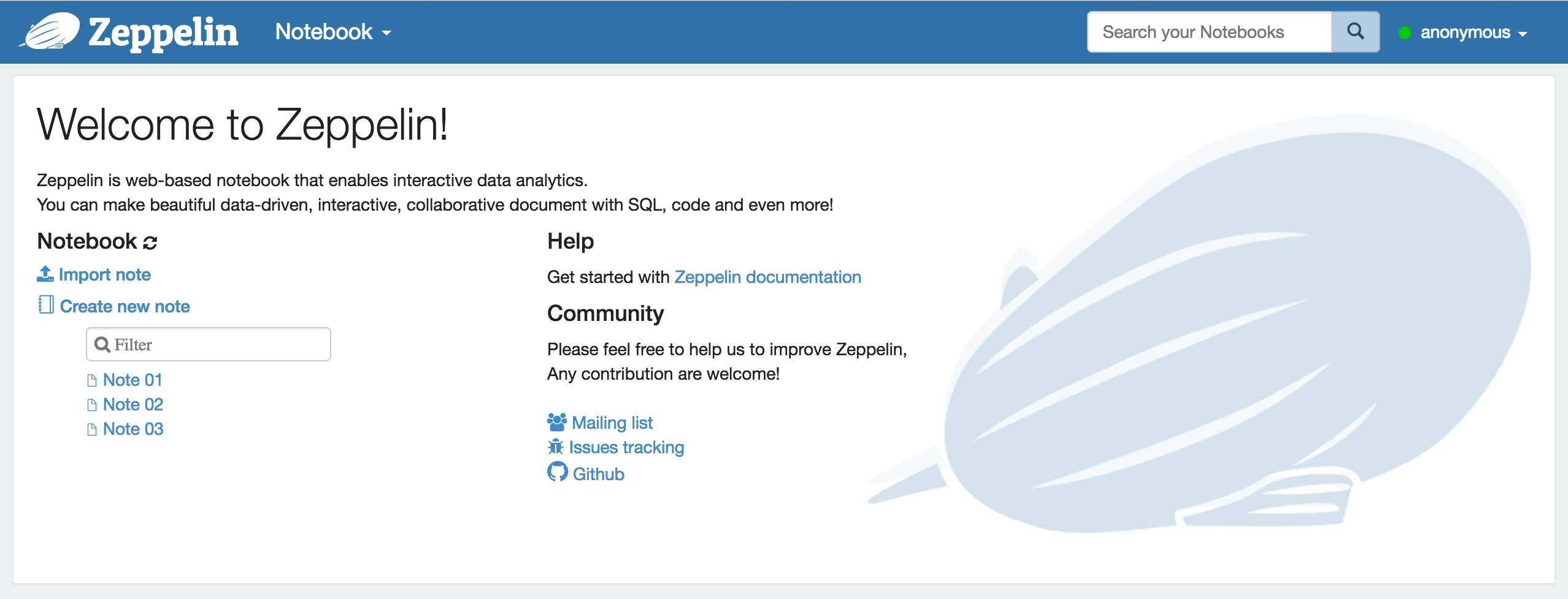 The first time you connect to Zeppelin, you'll land at the main page similar to the below screen capture.