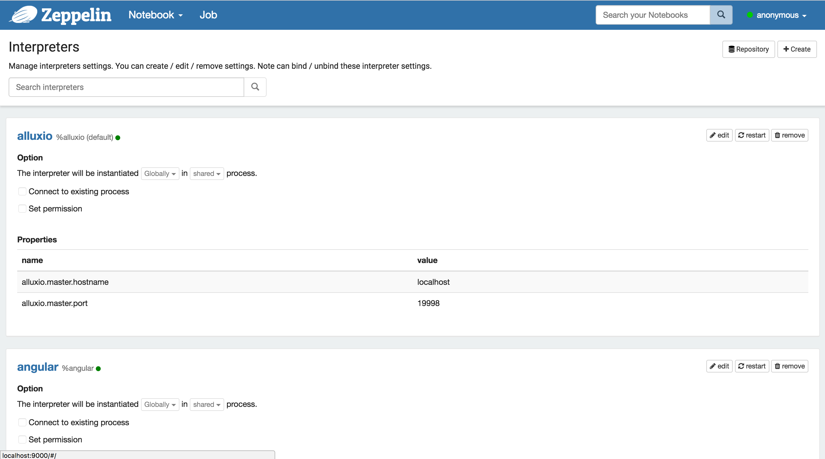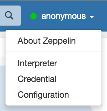 This menu gives you access to settings and displays information about Zeppelin. User name is set to anonymous if you use default shiro configuration. If you want to set up authentification, see Shiro authentication.