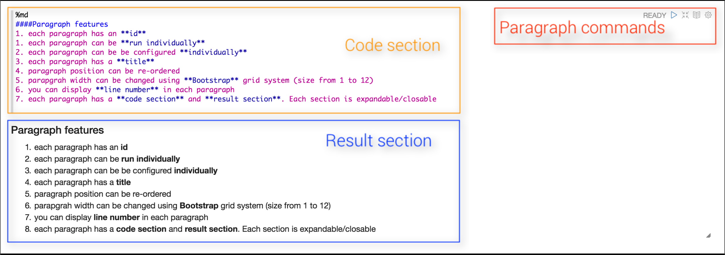 Each paragraph consists of 2 sections: code section where you put your source code and result section where you can see the result of the code execution.