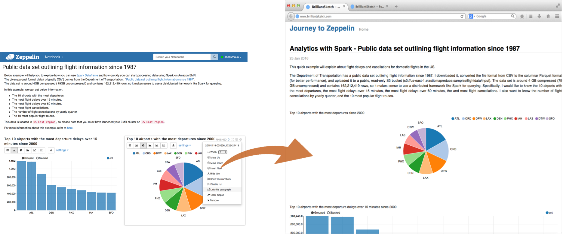 Apache Zeppelin aggregates values and displays them in pivot chart with simple drag and drop. You can easily create chart with multiple aggregated values including sum, count, average, min, max.