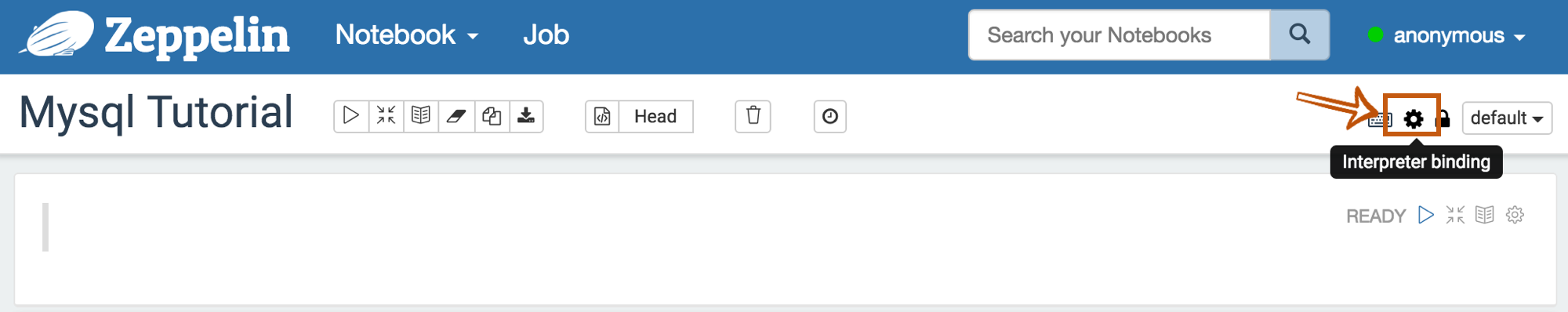 To bind the interpreters created in the interpreter setting page, click the gear icon at the top-right corner.