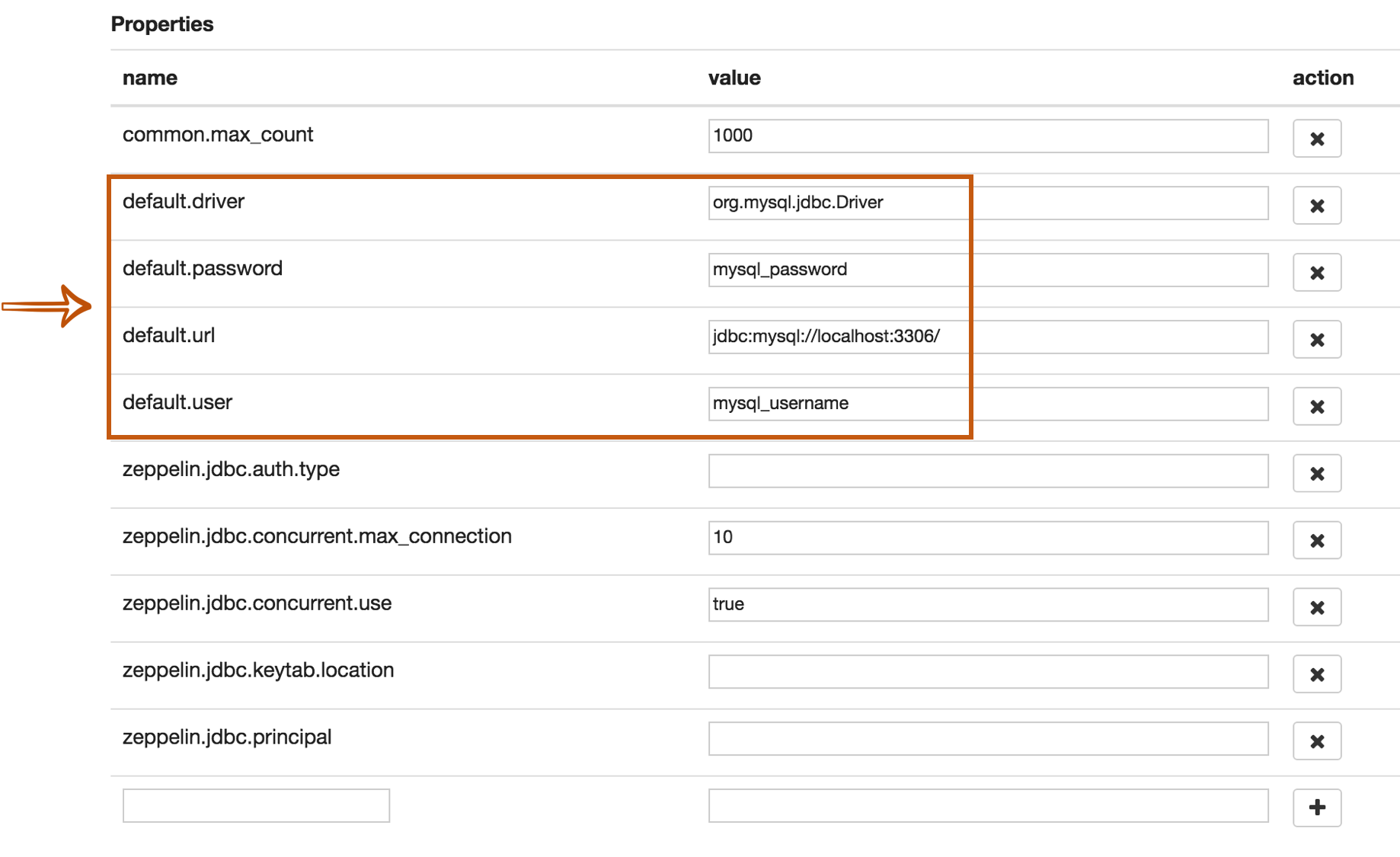 The JDBC interpreter properties are defined by default like below.