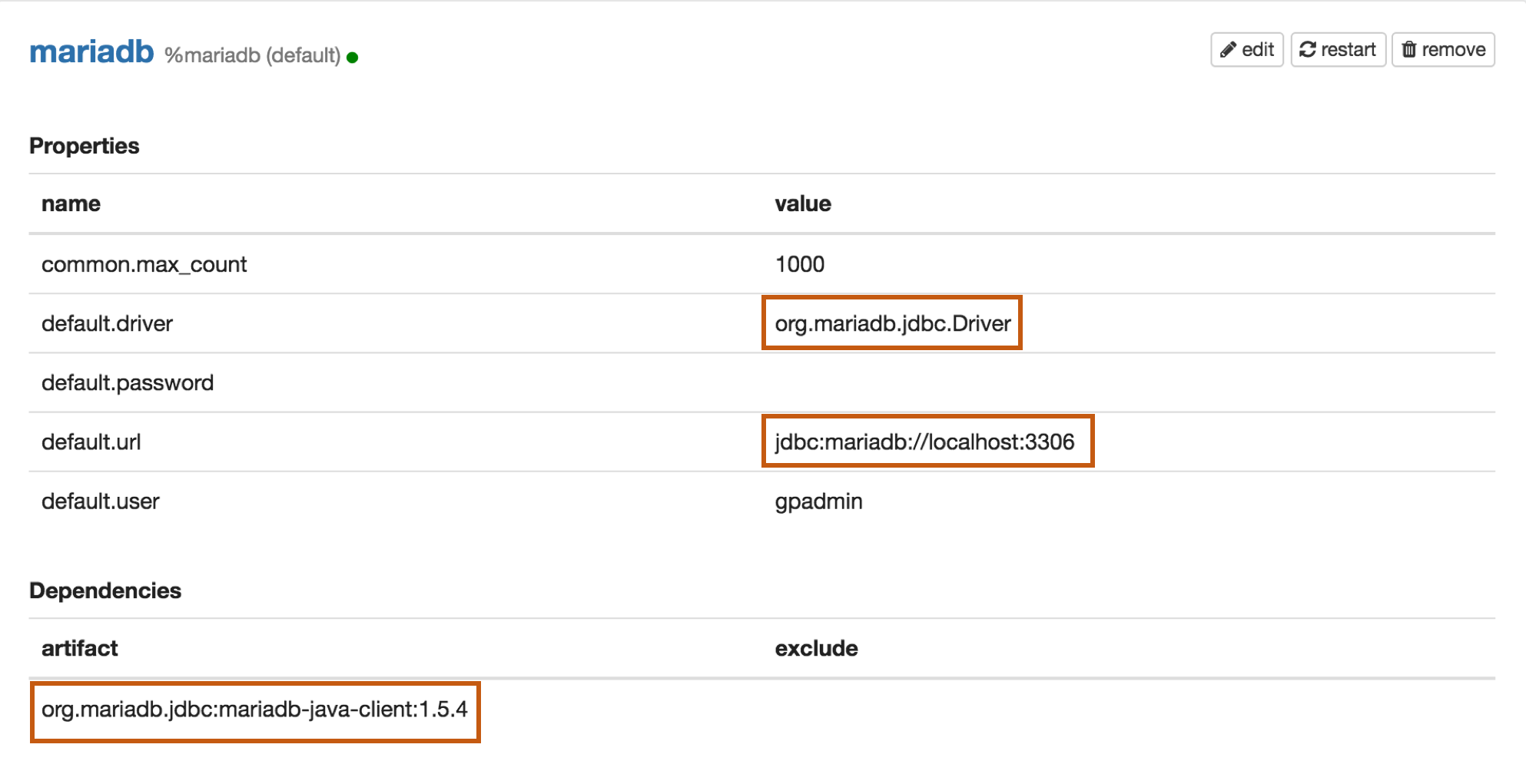 | default.driver | org.mariadb.jdbc.Driver |