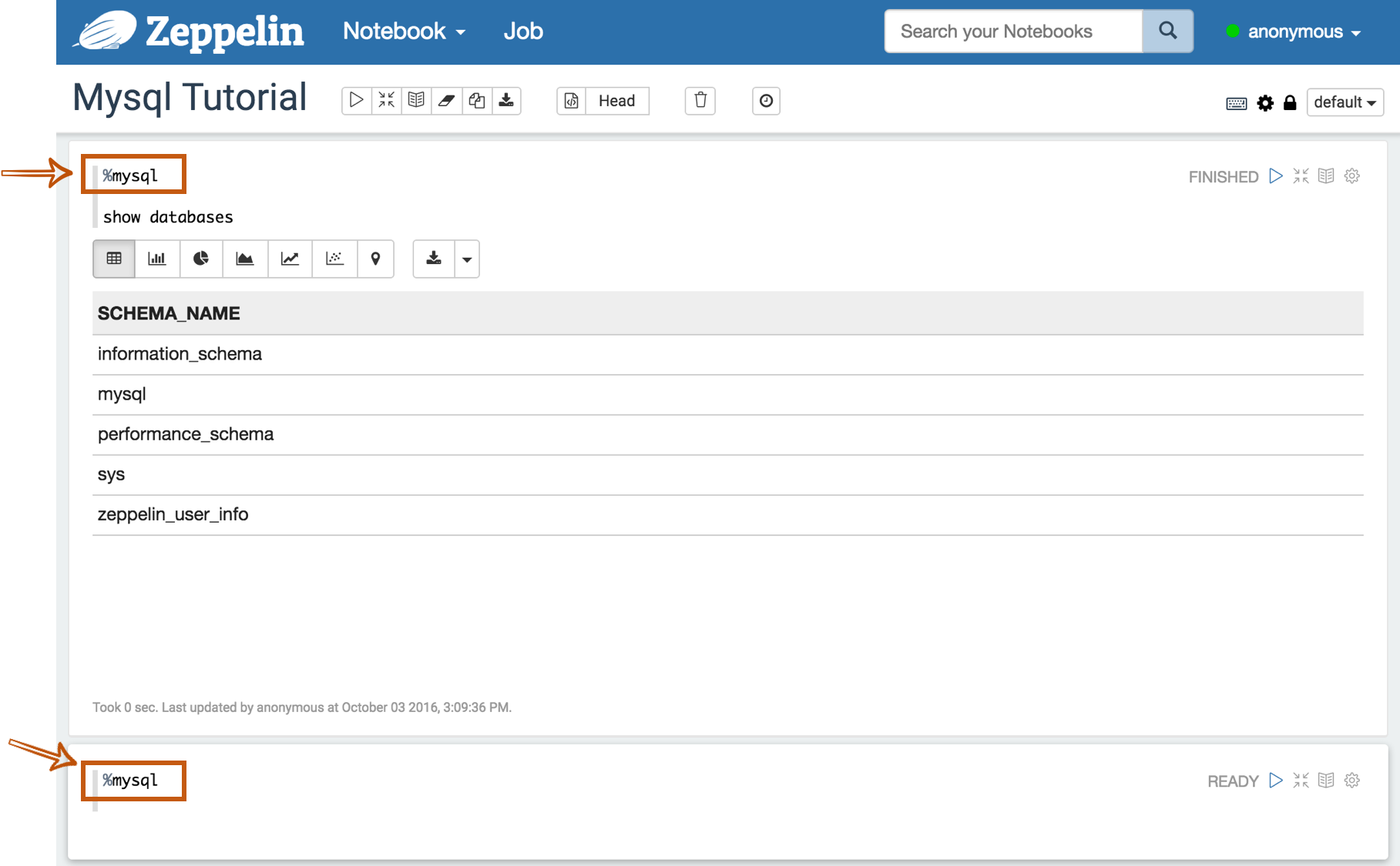 To test whether your databases and Zeppelin are successfully connected or not, type %jdbc_interpreter_name(e.g. %mysql) at the top of the paragraph and run show databases.