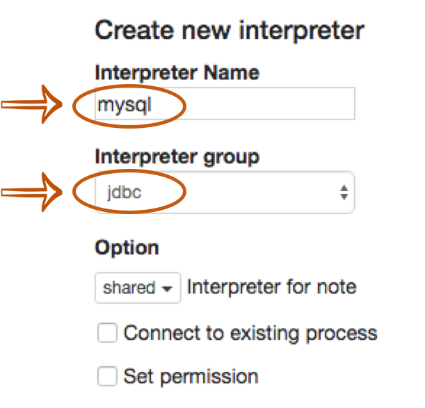 Fill Interpreter name field with whatever you want to use as the alias(e.g. mysql, mysql2, hive, redshift, and etc..). Please note that this alias will be used as %interpreter_name to call the interpreter in the paragraph.