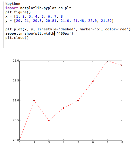 Will produce a 400x300 image in SVG format, which by default are normally 600x400 and PNG respectively. In the future, another option called angular can be used to make it possible to update a plot produced from one paragraph directly from another (the output will be %angular instead of %html). However, this feature is already available in the pyspark interpreter. More details can be found in the included "Zeppelin Tutorial: Python - matplotlib basic" tutorial notebook.