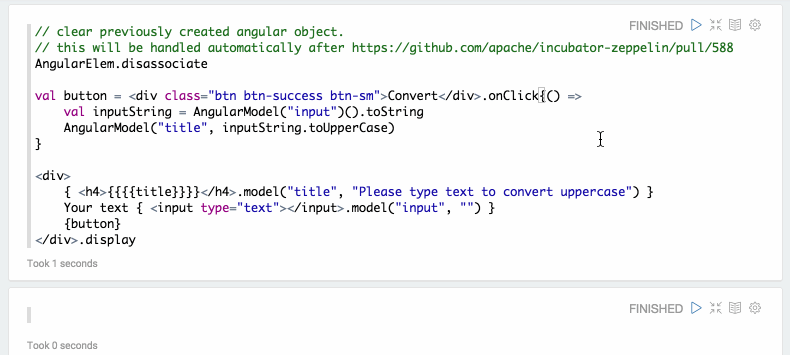 Through ZeppelinContext, you can bind / unbind variables to AngularJS view. Currently, it only works in Spark Interpreter ( scala ).