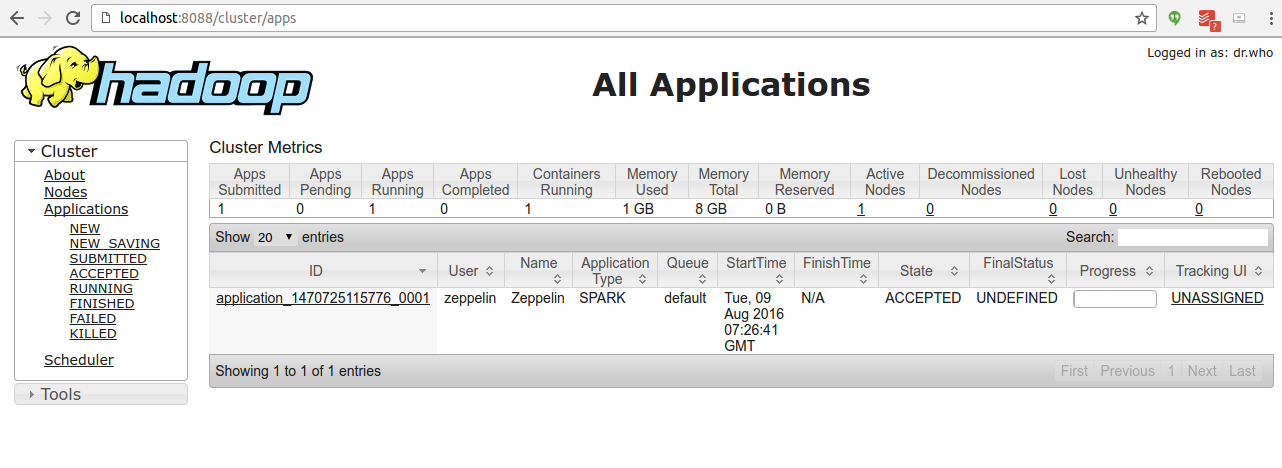 After running a single paragraph with Spark interpreter in Zeppelin, browse http://<hostname>:5050/#/frameworks and check Zeppelin application is running well or not.