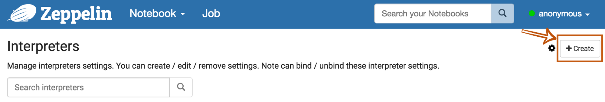 First, click + Create button at the top-right corner in the interpreter setting page.
