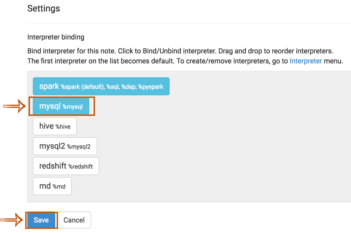 Fill Interpreter name field with whatever you want to use as the alias(e.g. mysql, mysql2, hive, redshift, and etc..). Please note that this alias will be used as %interpreter_name to call the interpreter in the paragraph.
