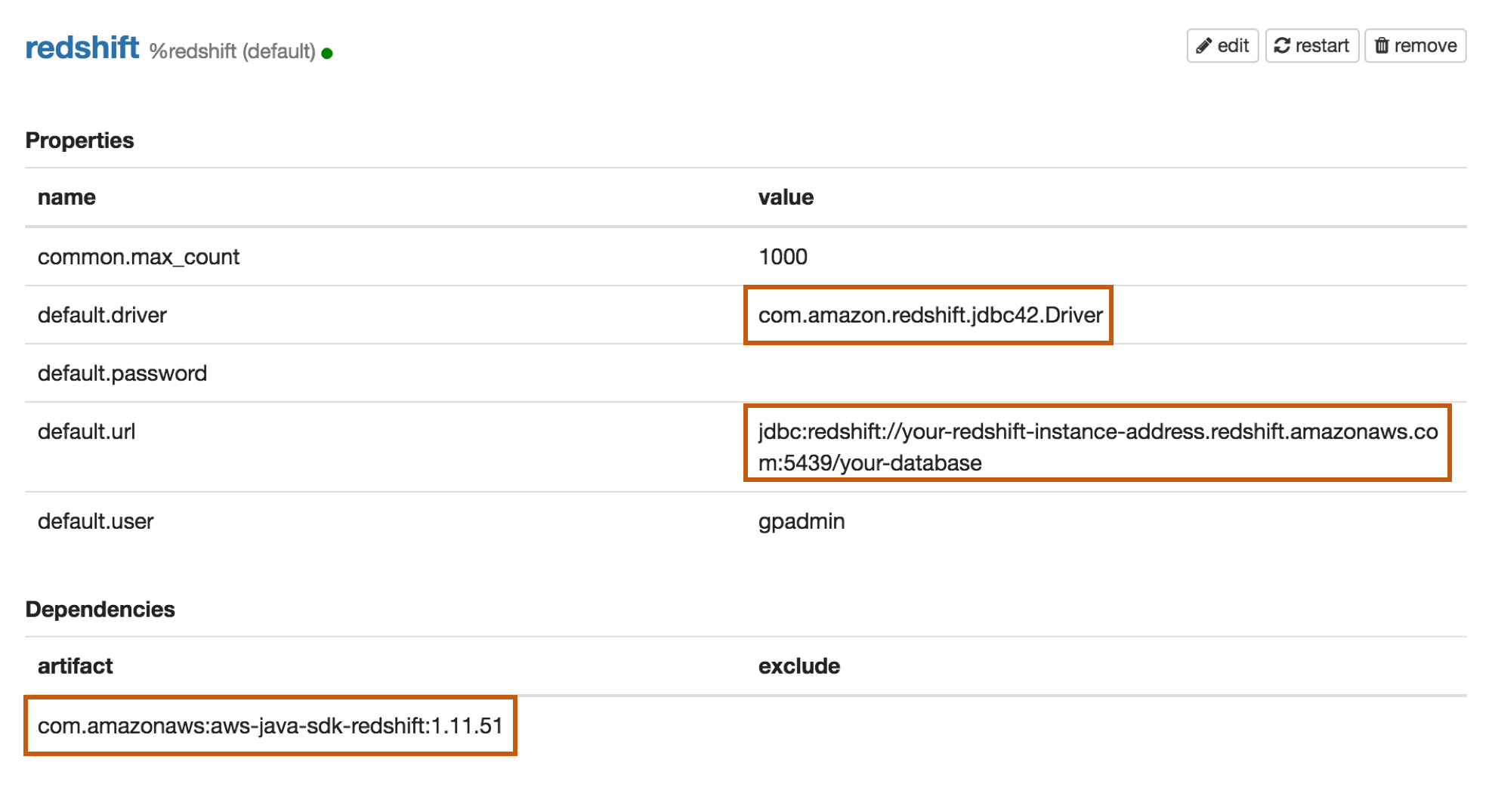 | default.url | jdbc:redshift://your-redshift-instance-address.redshift.amazonaws.com:5439/your-database |